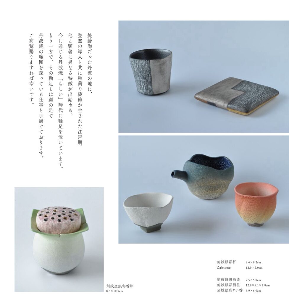 丹波焼らしい薪窯の作品と刻紋(猫描手)の作品、両方の展示を行います。