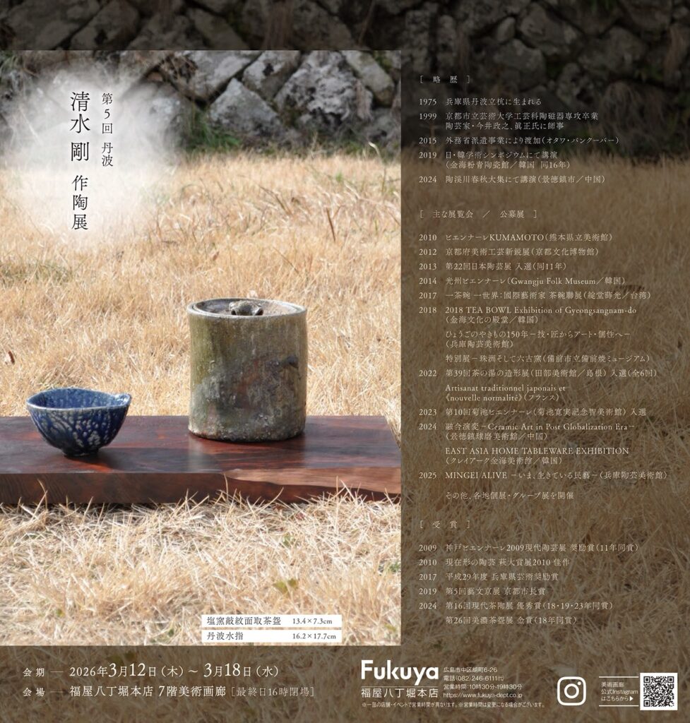 広島の百貨店「福屋」八丁堀本店 にて「第5回 丹波 清水剛 作陶展」を開催いたします。